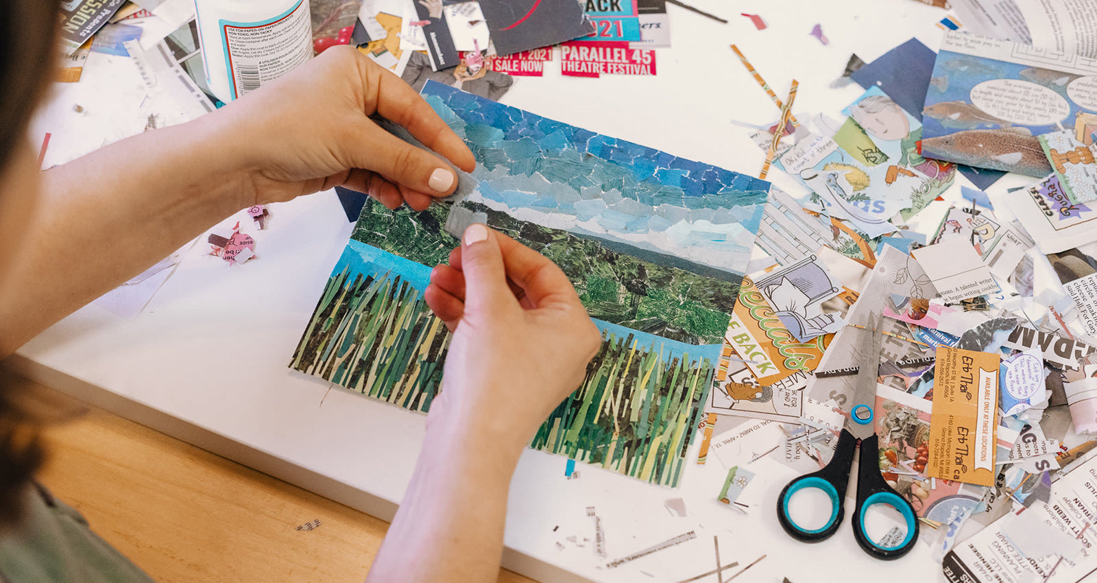Catherine Elizabeth depicts her world in a bright and richly-detailed way, using hundreds of pieces of hand-cut newspaper.