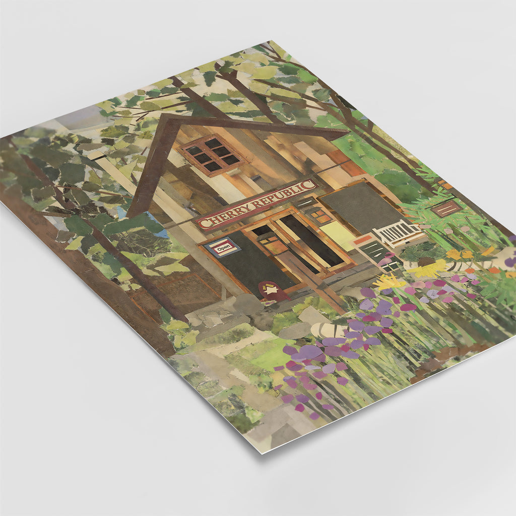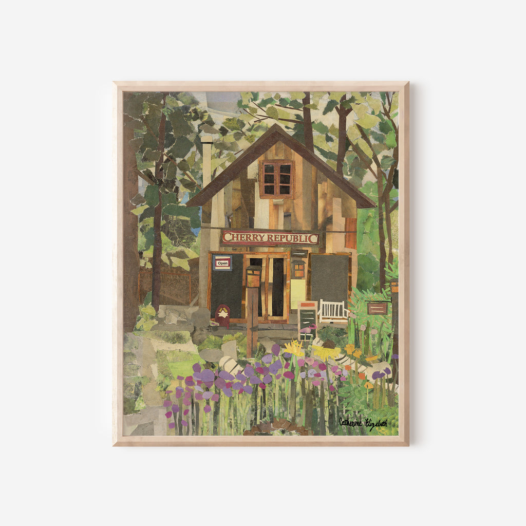 "Summer is for Cherries" is one of my three original pieces, which I created in the heart of Sleeping Bear Dunes. On a whim, I made the first few bodies of work by looking at a photo I took and started cutting, gluing, and hoping for the best! Looking through the newspaper on a hunt for the right colors to create this piece, I found an actual Cherry Republic logo serendipitously! The details within this artwork perfectly capture the picturesque Cherry Republic in Glen Arbor, Michigan.
